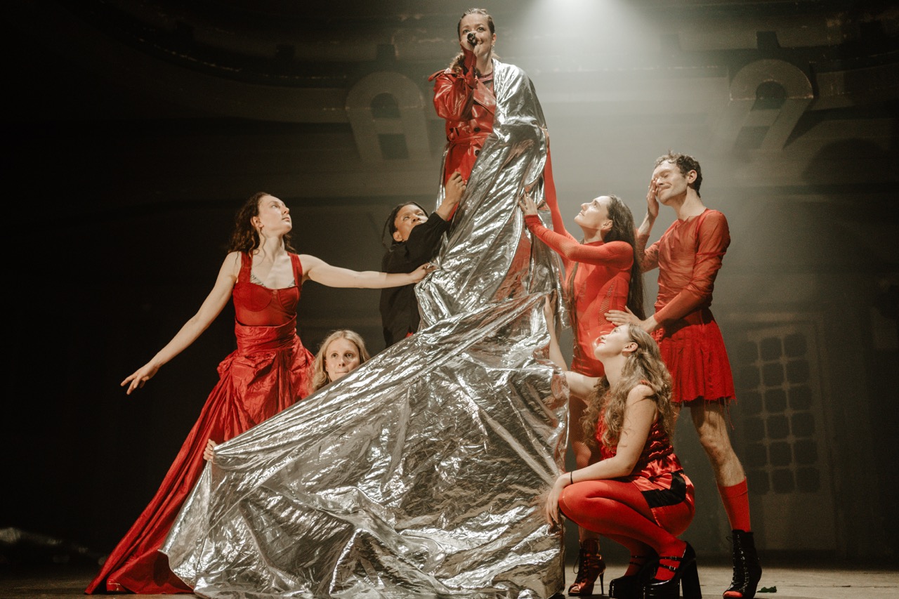Equally essential to the overall impact of the production are the costumes, which transform dynamically throughout the performance. They begin as a citation of antiquity, enriched with the motif of pure white fencing vests, continue through revolutionary erotic red, and end in absolute simplicity – an accentuation of “undressing” everything that restricts us. Most costume and scenographic elements are upcycled.